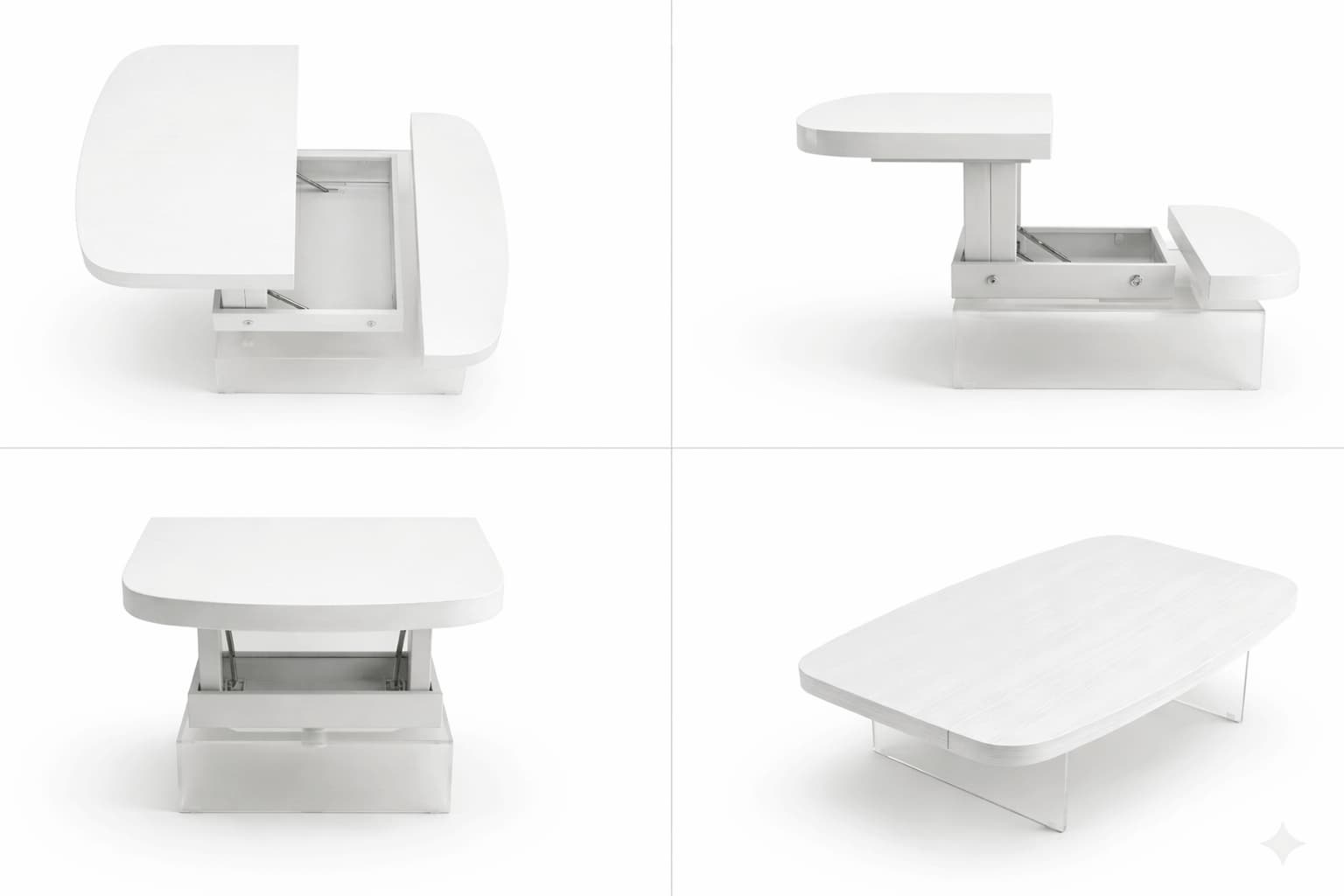 The Ultimate Multitasker Designed for the modern, fluid home, the LiftTop Coffee Table transitions effortlessly from a low-profile lounge piece to a functional work-from-home desk or dining surface. With its high-gloss white lacquer finish, it brings a clean, contemporary energy to your living room, adapting to your lifestyle in seconds.